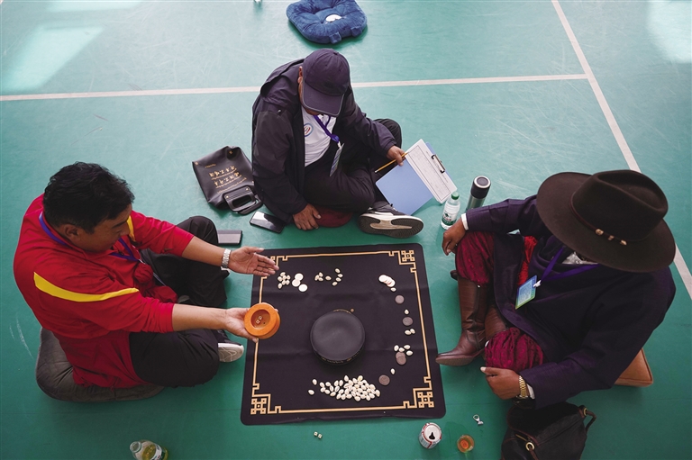 當(dāng)日,“吉韌”“秀茲”等項(xiàng)目一同開賽?! 凹g”也叫藏式克郎球,是藏族的一種彈指運(yùn)動(dòng)。比賽在一張邊長(zhǎng)約1米的正方形木桌球臺(tái)上進(jìn)行,球臺(tái)四角有4個(gè)小洞,黑、白兩種扁圓形球子各9個(gè),另有1個(gè)紅色球子放置在球臺(tái)中心,1個(gè)白色母球供雙方彈擊球子所用。