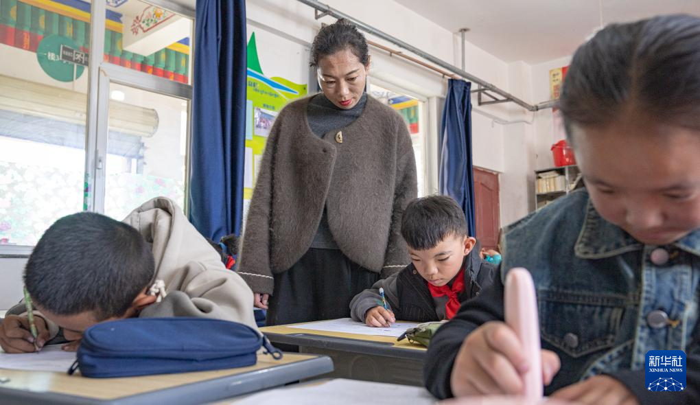 班戈縣中石化小學(xué)的老師德吉措姆在督促學(xué)生完成試卷(6月22日攝)。新華社記者 丁增尼達(dá) 攝