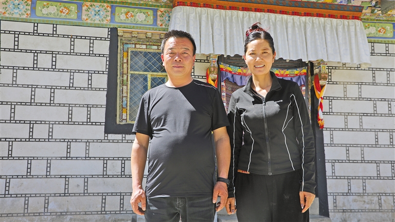 謝軍成達娃卓嘎夫婦在自家新房門前合影。