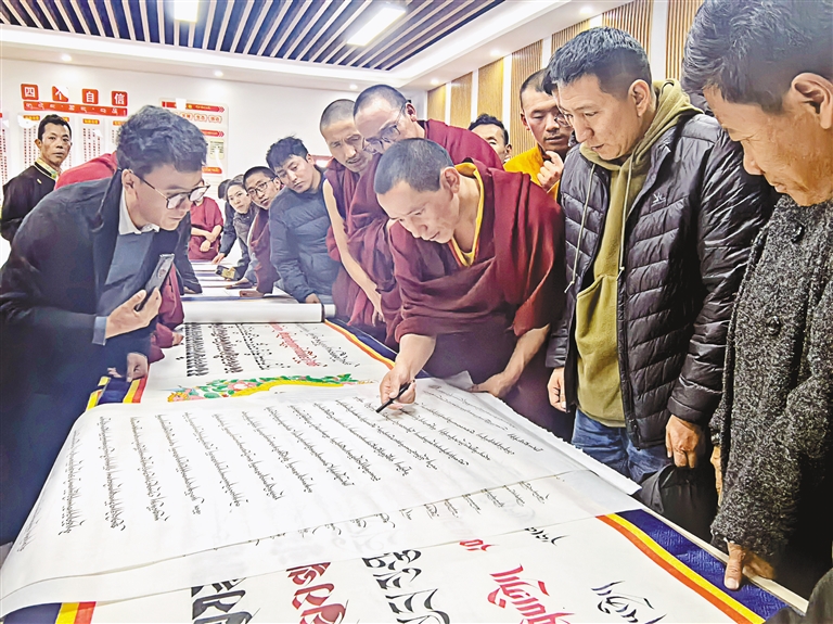 圖為日喀則市文聯(lián)組織書(shū)法協(xié)會(huì)開(kāi)展藏文書(shū)法交流活動(dòng)。