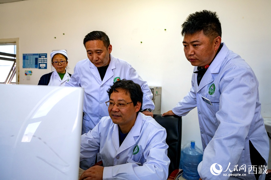 吳維(右一)和強(qiáng)巴旦增(右二)在查看患者的影像資料。人民日?qǐng)?bào)記者 徐馭堯攝