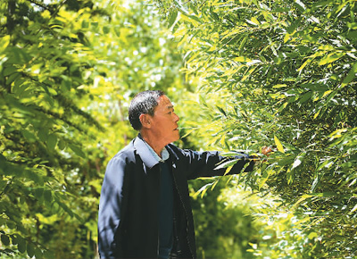 邊久在苗圃基地檢查樹苗生長情況。