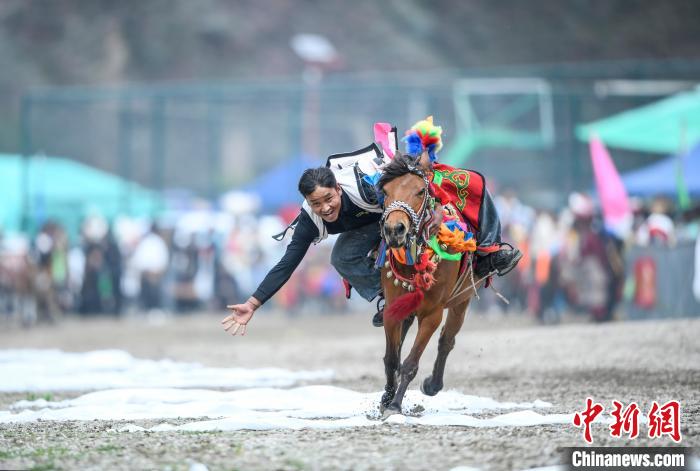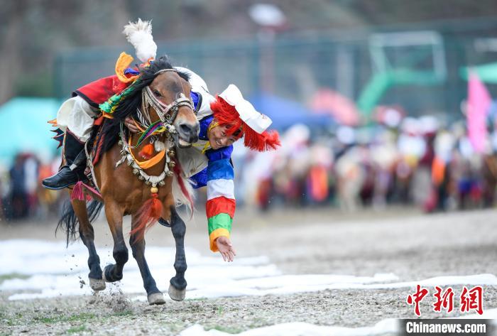 7月21日,西藏自治區(qū)拉薩市堆龍德慶區(qū)馬鎮(zhèn)朗巴村民眾賽馬歡度“望果節(jié)”?!巴?jié)”民俗已有1500多年的歷史,是國(guó)家級(jí)非物質(zhì)文化遺產(chǎn)。圖為騎手進(jìn)行馬術(shù)表演。中新社記者 貢嘎來(lái)松 攝