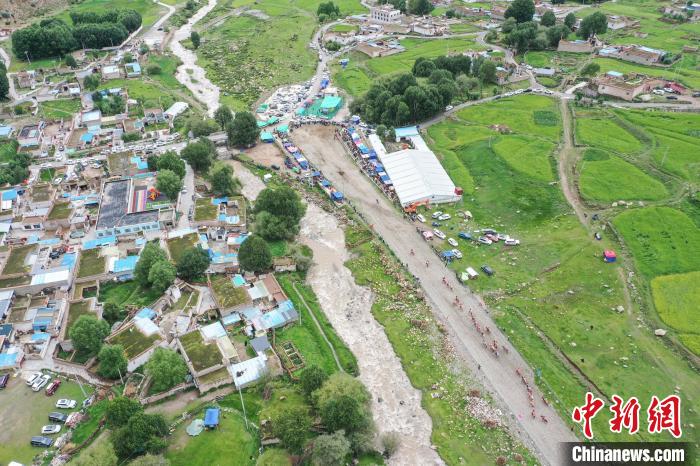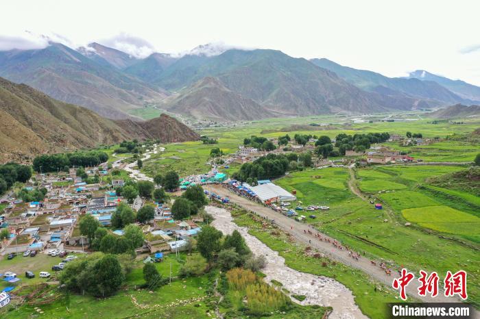 7月21日,西藏自治區(qū)拉薩市堆龍德慶區(qū)馬鎮(zhèn)朗巴村民眾賽馬歡度“望果節(jié)”?!巴?jié)”民俗已有1500多年的歷史,是國(guó)家級(jí)非物質(zhì)文化遺產(chǎn)。圖為賽馬比賽現(xiàn)場(chǎng)。(無(wú)人機(jī)照片)中新社記者 貢嘎來(lái)松 攝