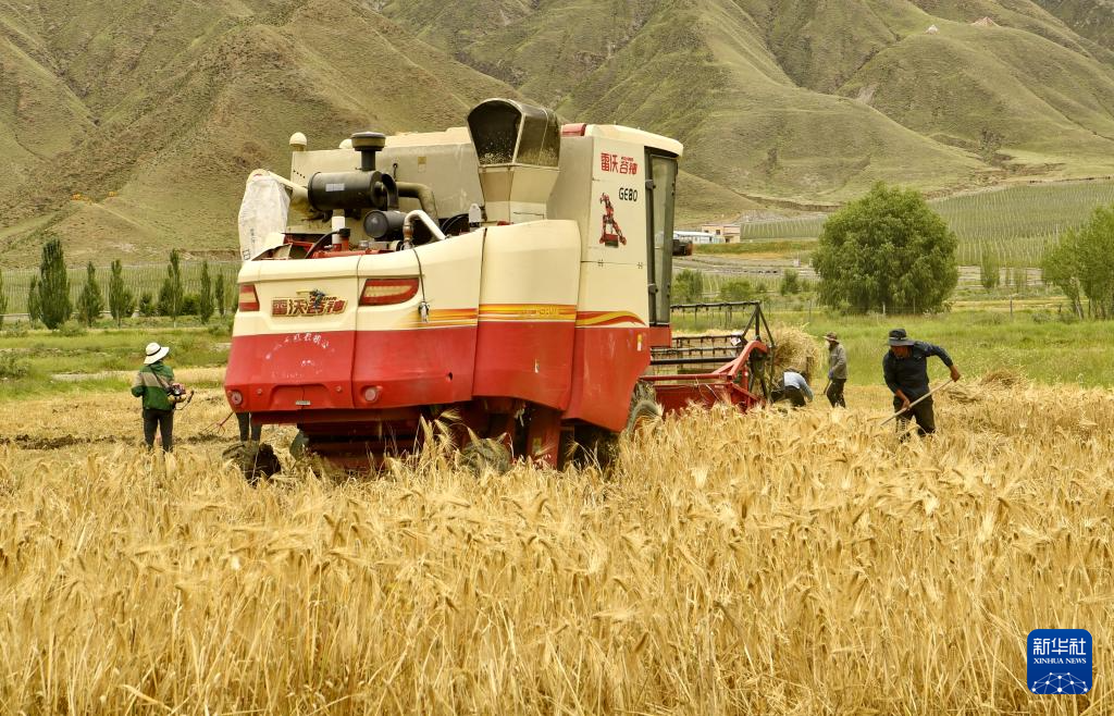 7月31日,聯(lián)合收割機在山南市扎囊縣扎其鄉(xiāng)朗賽嶺村的農(nóng)田里作業(yè)。新華社記者 張汝鋒 攝