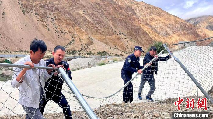 圖為普蘭邊檢民警與邊民搶修道路沿線防護(hù)欄。鐘悅祺 攝