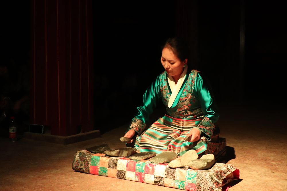 石琴使用天然的石塊作為伴奏樂器,從遠(yuǎn)古開始就在高原上被人演繹。演奏者手持兩塊小石頭,跪坐在幾塊類似琴鍵的大石頭前,大小石頭在不同位置碰撞出不同的音高,演奏者按一定音階順序?qū)⑹^排列在琴架上,演奏出悅耳的旋律。
