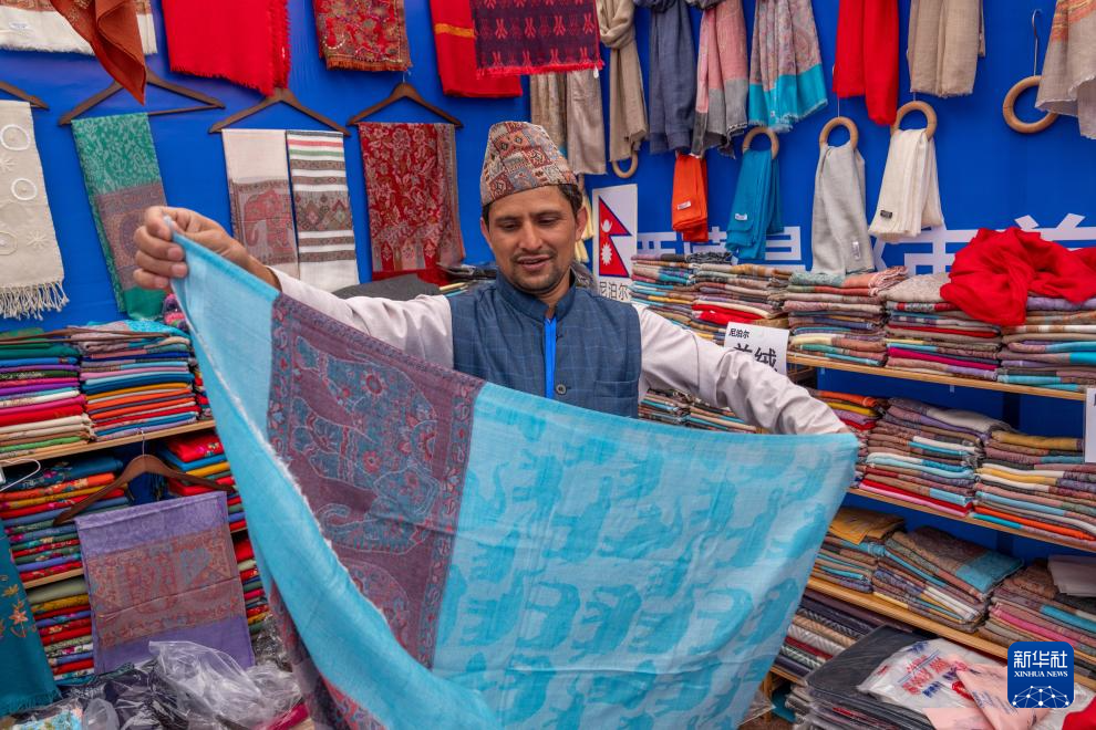 來(lái)自尼泊爾的商人蘇雷什·達(dá)卡爾在介紹他的披肩(8月19日攝)。新華社記者 旦增尼瑪曲珠 攝