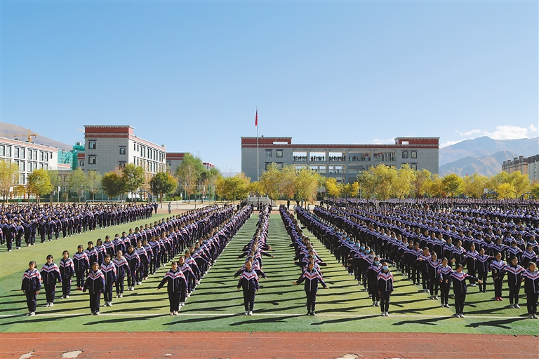圖為拉薩實驗中學(xué)的學(xué)生在做課間操。(圖片由江蘇援藏指揮部提供)