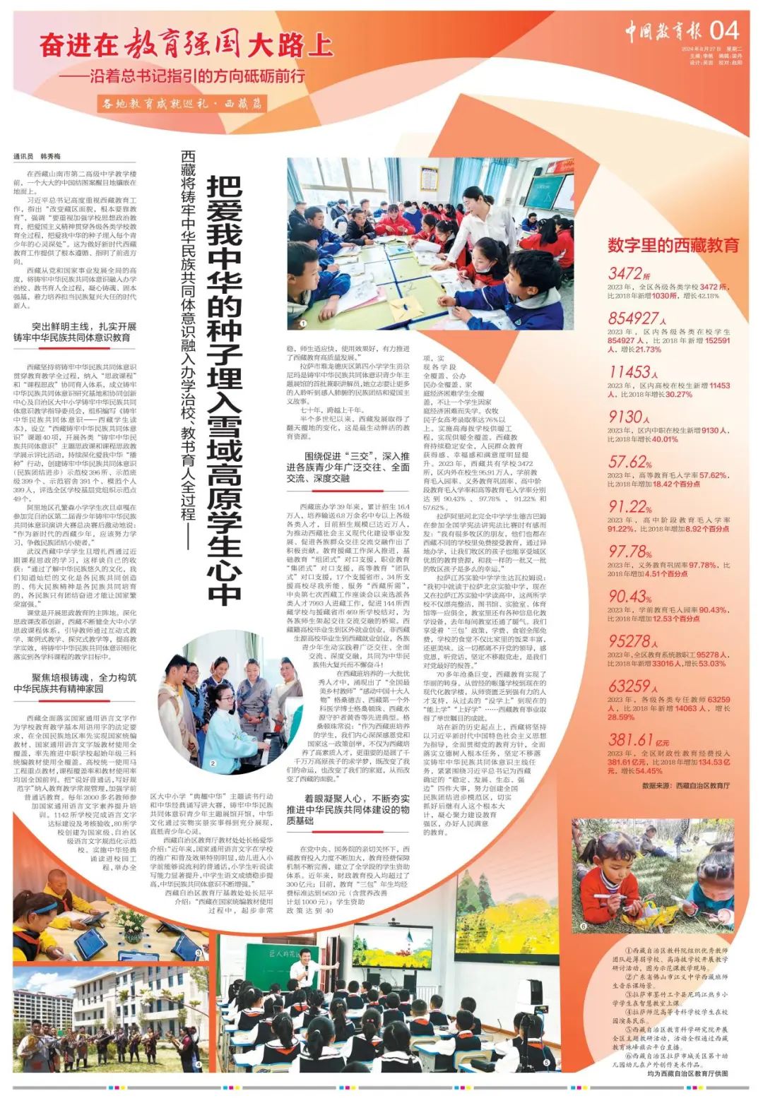習(xí)近平總書記高度重視西藏教育工作,指出“改變藏區(qū)面貌,根本要靠教育”,強(qiáng)調(diào)“要重視加強(qiáng)學(xué)校思想政治教育,把愛國主義精神貫穿各級各類學(xué)校教育全過程,把愛我中華的種子埋入每個(gè)青少年的心靈深處”。這為做好新時(shí)代西藏教育工作提供了根本遵循、指明了前進(jìn)方向。