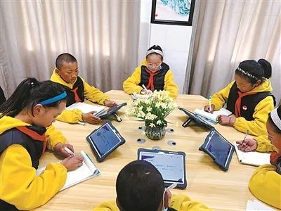 拉薩市墨竹工卡縣尼瑪江熱鄉(xiāng)小學(xué)學(xué)生在智慧教室上課。