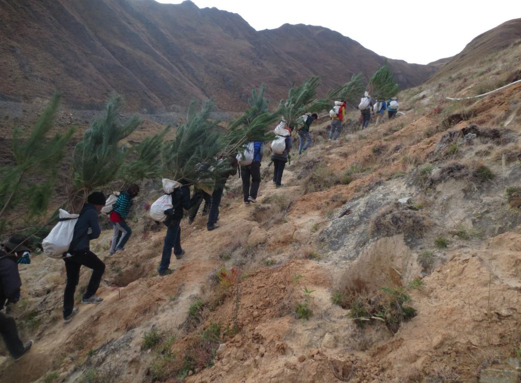 2022年3月,在拉薩南山公園西側(cè)山體造林期間,植樹人員背著土球苗上山。(受訪者供圖)