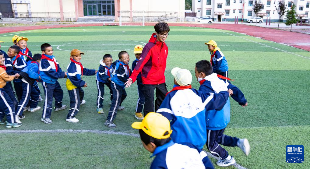 在娘蒲鄉(xiāng)中心小學(xué),嶺南師范學(xué)院支教隊(duì)成員胡正培課間與孩子們玩耍(9月3日攝)。新華社記者 丁增尼達(dá) 攝