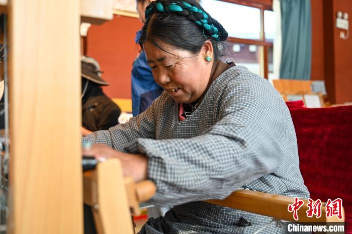 走進(jìn)位于西藏日喀則江孜縣的上海援建阿佳格桑工坊,次仁吉巴正在制作氆氌。中新網(wǎng)記者 貢確 攝