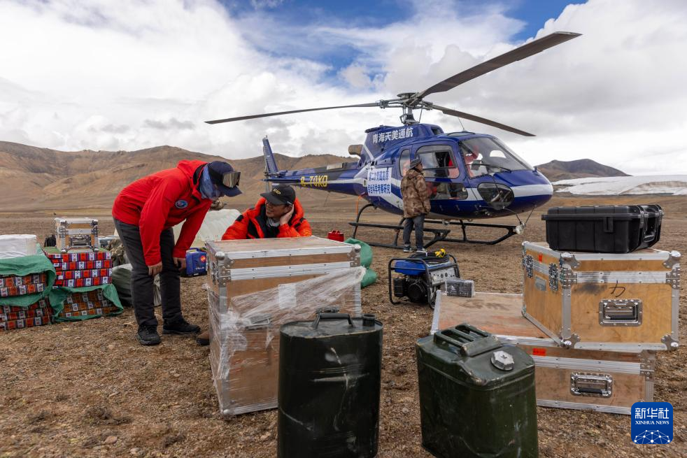 9月9日,徐柏青(中)和同事安排直升機(jī)將科考物資從海拔5400米的第二次青藏科考普若崗日冰原大本營(yíng)運(yùn)往海拔6100米的“Dome.C”點(diǎn)。新華社記者 姜帆 攝