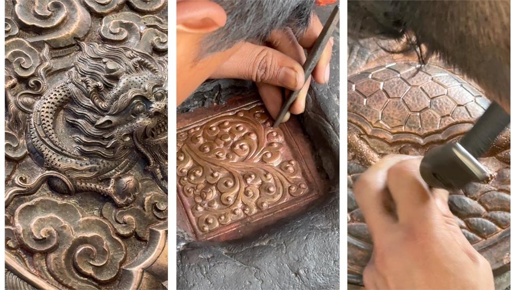 所謂錘揲法,是以銅片或金銀板片為原料,使用鐵臂、鐵套、榔頭、鏨子等工具,敲打出浮雕紋樣、各類造像、建筑裝飾等,對(duì)工匠造型能力與經(jīng)驗(yàn)要求很高。