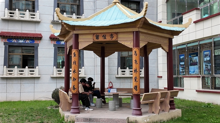 學(xué)生正在校園內(nèi)的涼亭里讀書。