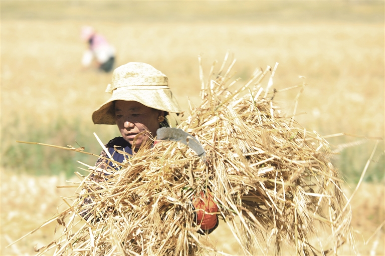 金秋九月,風吹麥浪、穗粒飽滿,連日來,在墨竹工卡縣金黃色的農(nóng)田里,處處可見勤勞的農(nóng)民們搶抓時機,開展小油菜和青稞收割、晾曬、搬運、儲藏,確保糧食顆粒歸倉。