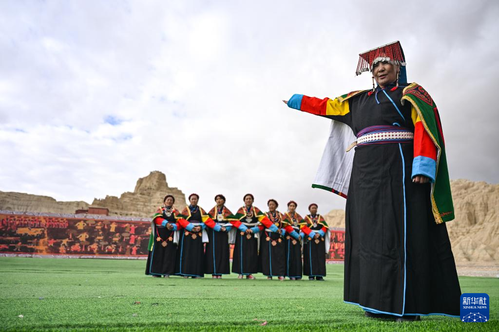 在西藏阿里地區(qū)札達(dá)縣古格王國(guó)遺址腳下,自治區(qū)級(jí)“宣舞”非遺傳承人央金(右)介紹“宣舞”(9月11日攝)。新華社記者 孫瑞博 攝