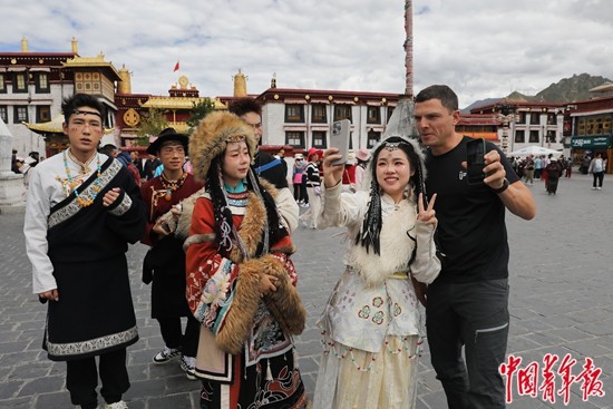 9月2日,西藏拉薩市八廓街,來(lái)自俄羅斯的巴德里(右一)與身穿藏族傳統(tǒng)服裝的年輕游客合影留念。近年來(lái),來(lái)拉薩旅游,到八廓街、布達(dá)拉宮廣場(chǎng)拍一套藏服寫(xiě)真,已經(jīng)成為進(jìn)藏旅游年輕人的“標(biāo)配”。中青報(bào)·中青網(wǎng)記者 孔斯琪/攝