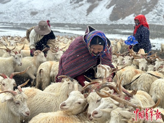 9月13日,西藏阿里地區(qū)日土縣熱幫鄉(xiāng)龍門(mén)卡村迎來(lái)了一場(chǎng)雪。在海拔近4800米的龍門(mén)卡村夏季牧場(chǎng),牧民們把待擠奶的白絨山羊依次用繩子拴起來(lái)。中青報(bào)·中青網(wǎng)記者 石佳/攝