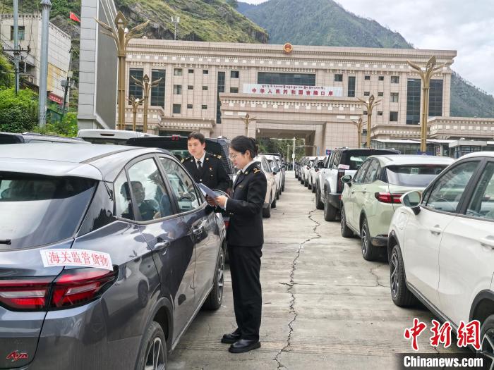 圖為在吉隆口岸,海關(guān)工作人員驗(yàn)放車輛。資料圖 拉薩海關(guān) 供圖