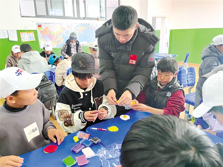 圖為支教隊(duì)員余梓鑫和孩子們一起完成課堂小游戲。