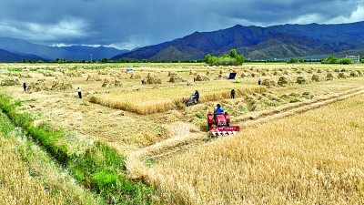 西藏日喀則市白朗縣巴扎鄉(xiāng)近年推廣“藏青3000”等青稞新品種和機(jī)械化種植,圖為農(nóng)民在收獲青稞。新華社發(fā)