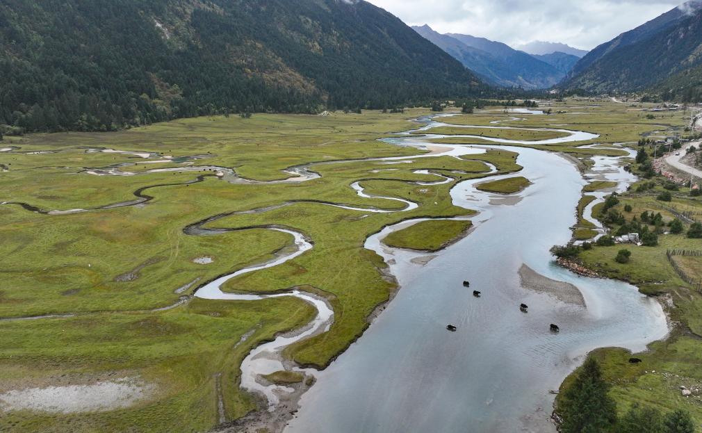 10月4日,在林芝工布江達(dá)縣,一隊(duì)牦牛涉水通過河流(無人機(jī)照片)。新華社記者 晉美多吉 攝