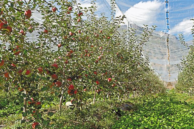 矮砧寬行密植的蘋果樹被劃分成一個(gè)個(gè)區(qū)域。“這是我們的多功能網(wǎng)室,是一種以高密度聚乙烯為主料的防護(hù)網(wǎng)。能抗大風(fēng),減少冰雹、暴曬等惡劣天氣帶來的影響。”增巴村蘋果種植基地技術(shù)員劉傳海介紹道。