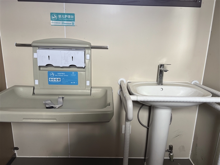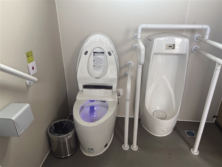 公廁內(nèi)部除了正常的蹲位,還設(shè)有第三衛(wèi)生間。第三衛(wèi)生間內(nèi)配有嬰兒護(hù)理臺、嬰兒安全座椅等設(shè)施。除此之外,第三衛(wèi)生間還設(shè)有安全扶手、智能馬桶等設(shè)備,方便腿腳不方便的老年人及殘疾人。智能馬桶旁還安裝有緊急報警器?!叭绻欣先嗽趲?,就可以按一下緊急報警器。這也是我們考慮到殘疾人、老年人如廁不方便,增設(shè)的人性化設(shè)計?!背嗔姓f。