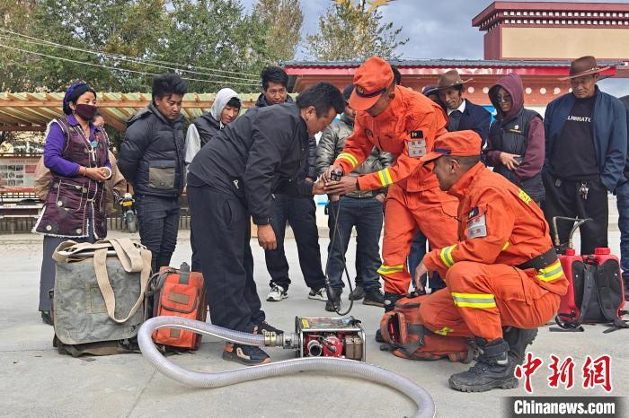 圖為消防員為護(hù)林員講解裝備操作方法。西藏森林消防供圖