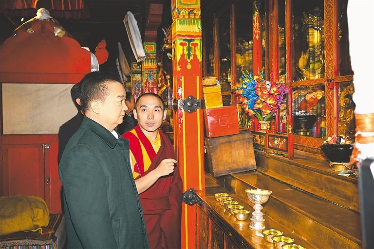 王君正深入寺廟開展調(diào)研,與僧尼親切交流。扎西吉培寺坐落于謝通門縣,歷史悠久、氣勢恢宏。王君正來到這里,詳細了解該寺加強和創(chuàng)新寺廟管理、寺廟歷史、文物保護等情況,聽取“三個意識”教育工作開展情況匯報。指出,要進一步深化拓展“三個意識”教育,總結(jié)提升好經(jīng)驗好做法,對該寺結(jié)合實際建立“六項機制”,完善僧尼綜合考核,推動僧尼實現(xiàn)自我教育、自我管理、自我約束等工作進行總結(jié)提煉、不斷完善;依法加強宗教事務管理,掌握宗教工作科學方法,推動宗教事務管理法治化、規(guī)范化、常態(tài)化,強化寺管會工作職能,加強寺管會干部隊伍建設,推動宗教工作由“管得住”向“管得好”轉(zhuǎn)變。王君正在考察了解到該寺珍藏著《甘珠爾》《丹珠爾》等文物古籍時指出,要加強文物古籍保護利用,切實提高文物保護的科技含量和裝備水平,讓珍貴古籍、文物資源煥發(fā)新生、世代傳承,留住歷史的痕跡和文明的根脈。王君正對該寺組織僧尼前往區(qū)外學習參觀感到高興,指出,加強西藏宗教界與區(qū)外交流學習是鑄牢中華民族共同體意識的具體體現(xiàn),對于深入推動各民族交往交流交融將起到積極促進作用,必將進一步構(gòu)筑中華民族共有精神文化家園。