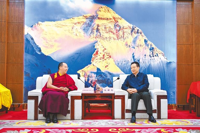 調(diào)研結(jié)束后,王君正在日喀則市會見了班禪額爾德尼·確吉杰布,對其在藏各項活動的順利開展、圓滿成功表示祝賀。王君正指出,班禪額爾德尼·確吉杰布回藏履職以來,深入貫徹習近平總書記關(guān)于宗教工作、西藏工作的重要指示和新時代黨的治藏方略,深入學習宣傳“三個意識”,廣泛接觸基層干部群眾和寺廟僧尼,積極宣傳黨的民族宗教政策,在推進藏傳佛教中國化、鑄牢中華民族共同體意識、引導信眾投身社會主義現(xiàn)代化新西藏建設等方面做了積極有效的工作。希望班禪額爾德尼·確吉杰布進一步學習領(lǐng)會習近平總書記重要指示精神,堅定不移維護祖國統(tǒng)一、加強民族團結(jié),全力維護社會和諧穩(wěn)定的良好局面;堅定不移推進藏傳佛教中國化,對教規(guī)教義作出通俗易懂、與時俱進的闡釋;堅定不移深化拓展“國家意識、公民意識、法治意識”教育,把各方面力量凝聚起來,奮力推進社會主義現(xiàn)代化新西藏建設。