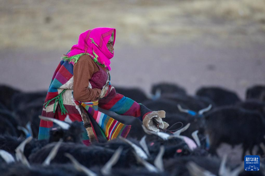 措勤縣紫絨山羊原種場(chǎng)的一位牧工在照看優(yōu)質(zhì)種羊群(11月20日攝)。新華社記者 姜帆 攝