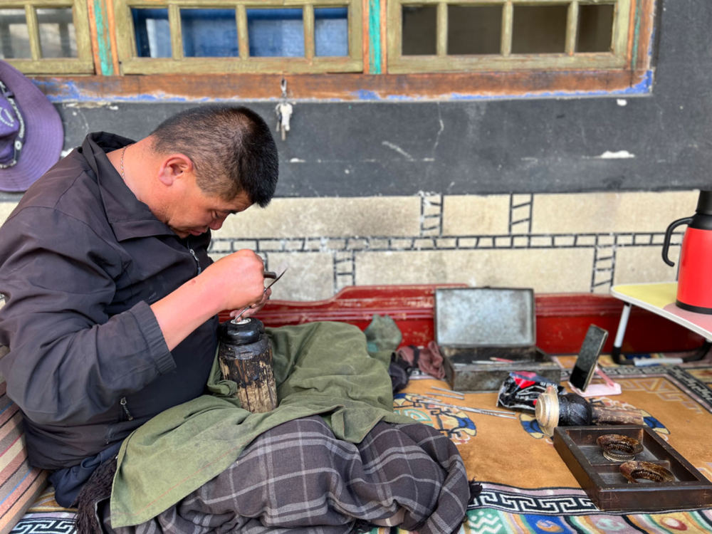 在工布次仁旁邊,另一位古藝大師邊巴扎西正在制作一件銀器。這是一件茶托,湊近看,隱約能看見密密麻麻的小點,這是敲擊留下的印記。邊巴扎西把茶托罩在一根豎起的木棍上,繼續(xù)給它塑形。簡單樸素的制作工具背后,是執(zhí)著的匠心。