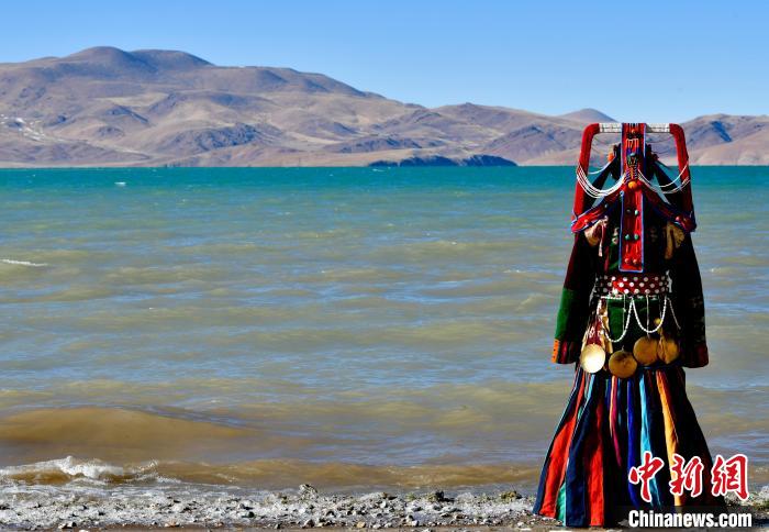 圖為12月7日,當(dāng)?shù)孛癖娫谏暝h格仁錯湖畔展示巴扎服飾。中新社記者 李林 攝