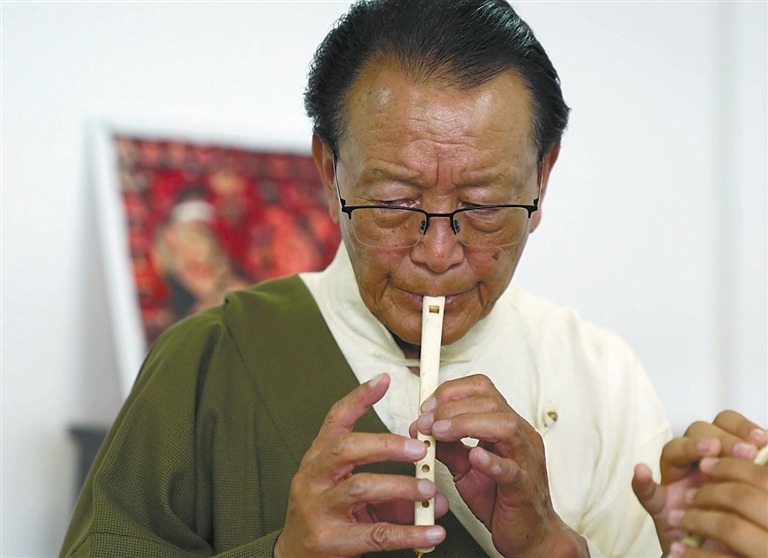 圖為國(guó)家一級(jí)演奏員次旦正在吹奏鷹笛。