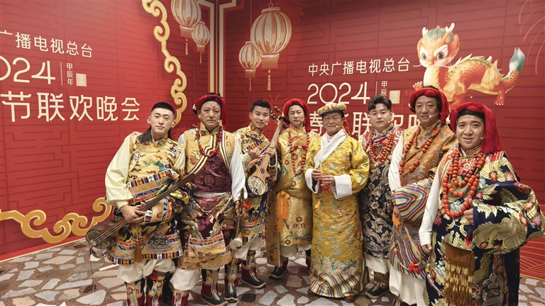 圖為國(guó)家一級(jí)演奏員次旦(右四)在中央廣播電視總臺(tái)2024春晚后臺(tái)與其他表演者合影。