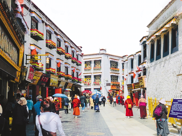 如今的八廓街,已成為獨(dú)具民族特色和魅力的傳統(tǒng)文化街區(qū),吸引著來自各地的游客。正如來自武漢的游客李玥所說:“西藏是一生必來之地,我們在老家舉辦完婚禮后,將蜜月旅行地選在了日光之城拉薩。走進(jìn)八廓街,仿佛穿越了時(shí)空的隧道,色彩斑斕的建筑,每一座建筑都在訴說著古老的故事。八廓街,有著不同的顏色、不同的人文、不同的語言、不同的建筑、不同的穿著,一切都是那么的不同?!?/p>