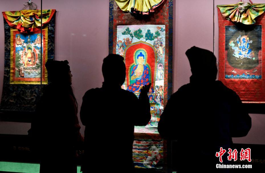 以“見證與守望——鑄牢中華民族共同體意識(shí)主題展”為主題的展覽近日亮相西藏自治區(qū)拉薩市布達(dá)拉宮珍寶館。本次主題展精選100余件文物珍品,展覽通過文物、古籍及布達(dá)拉宮的傳承與發(fā)展,講述各民族交往交流交融的故事。圖為1月2日,觀眾拍攝展覽中的唐卡。中新社記者 李林 攝