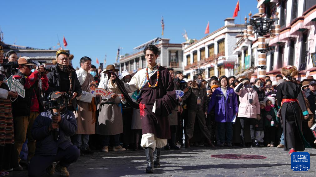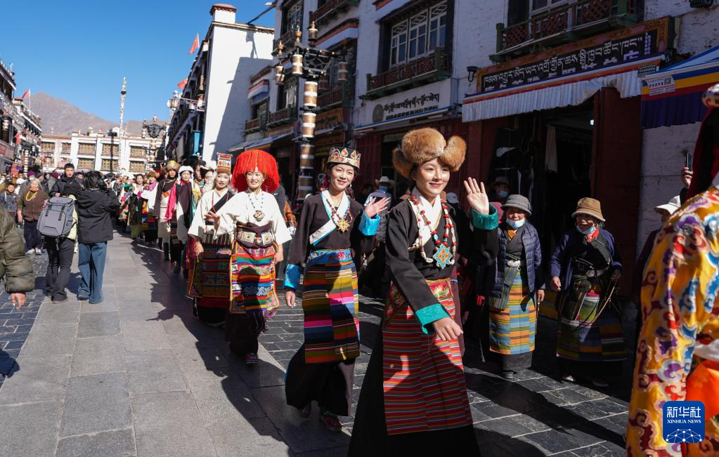 作為拉薩市文化和旅游局主辦的“繁飾自然·衣彩拉薩——拉薩新年服飾秀”群眾文化活動(dòng)的一部分,1月3日,穿著傳統(tǒng)藏裝的模特巡游在拉薩八廓街。