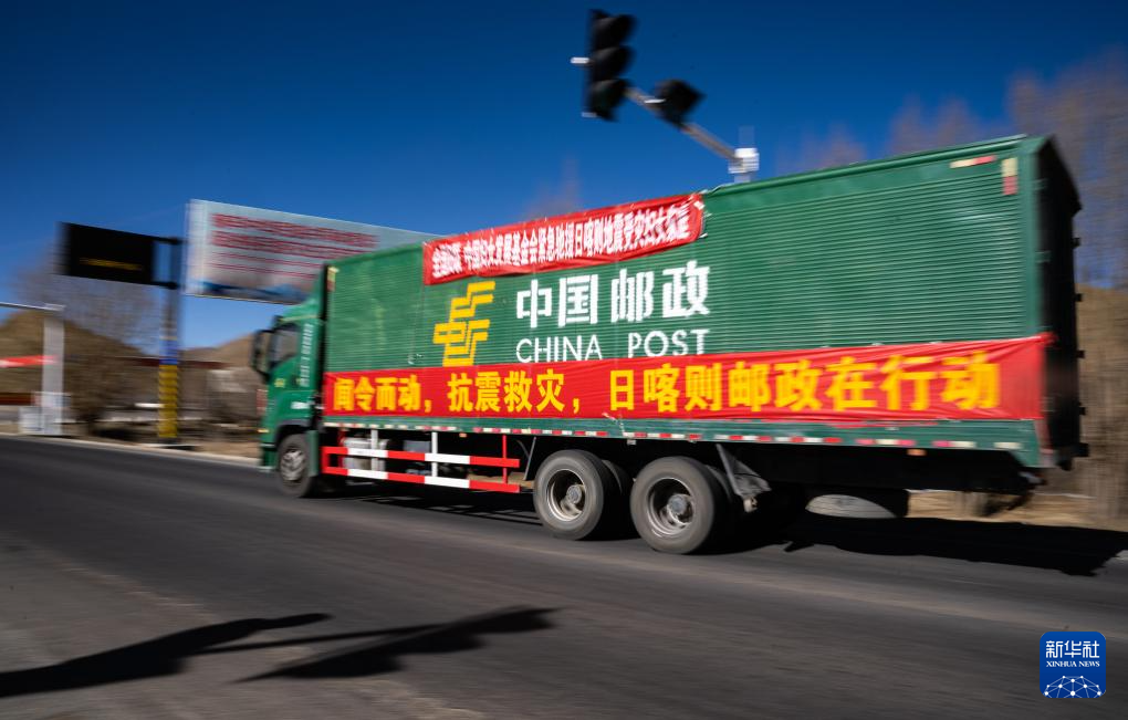 1月8日,在日喀則市境內(nèi)的318國道,中國郵政的抗震救災(zāi)運(yùn)輸車輛向災(zāi)區(qū)方向駛?cè)?。新華社記者 丁增尼達(dá) 攝