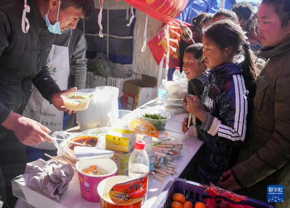 1月8日,在日喀則市定日縣長所鄉(xiāng)森嘎村的臨時安置點,馬仁(左一)為受災(zāi)小朋友免費(fèi)供應(yīng)面食。據(jù)馬仁介紹,他來自定日縣,和朋友一起來臨時安置點為災(zāi)區(qū)群眾免費(fèi)提供面食。據(jù)悉,從7日下午兩點開始,他們已送出近1200份面食。新華社記者 丁汀 攝