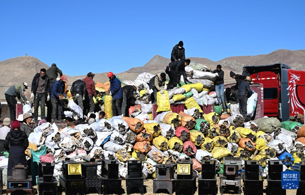 1月9日,受災群眾在措布村卸載救災物資。新華社記者 李響 攝