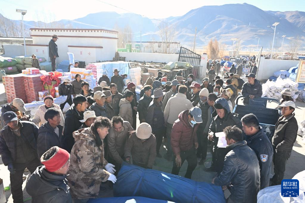 1月9日,受災群眾在措布村村委會領取救災物資。新華社記者 李響 攝