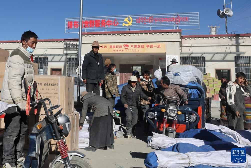1月9日,受災群眾在措布村村委會領取帳篷等救災物資。新華社記者 姜帆 攝