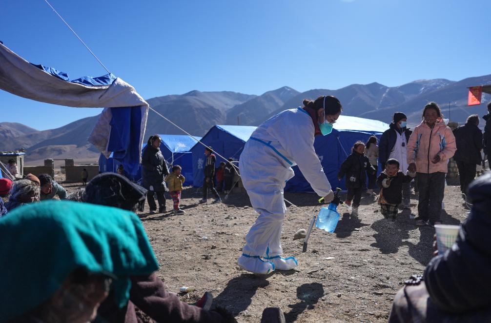 1月8日,在定日縣措果鄉(xiāng)野江村安置點,醫(yī)護人員進行消殺。
