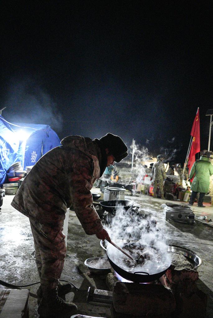 1月7日,在定日縣古榮村集中安置點,解放軍為受災(zāi)群眾做飯。