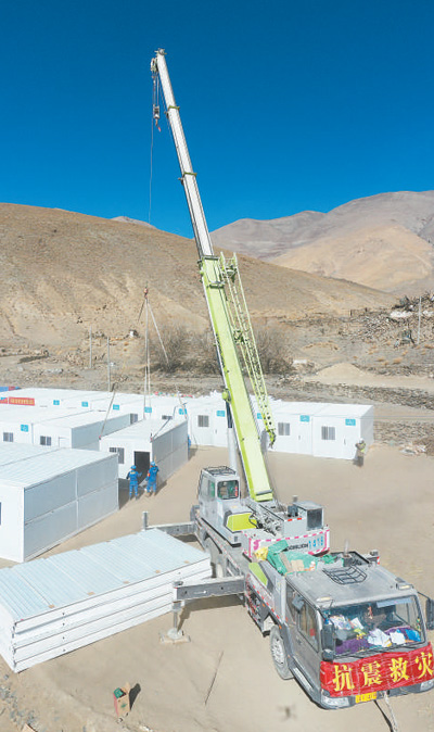 為保障受災(zāi)群眾從應(yīng)急性臨時(shí)安置轉(zhuǎn)為固定性過渡安置,震后第二天,首批新式折疊板房就運(yùn)抵定日縣。